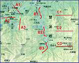 穿越線取樣法(A.橫越馬路、B.沿著溪流、C.特定方向) |